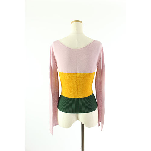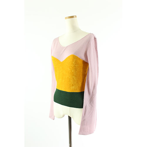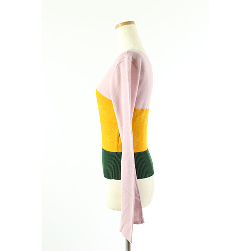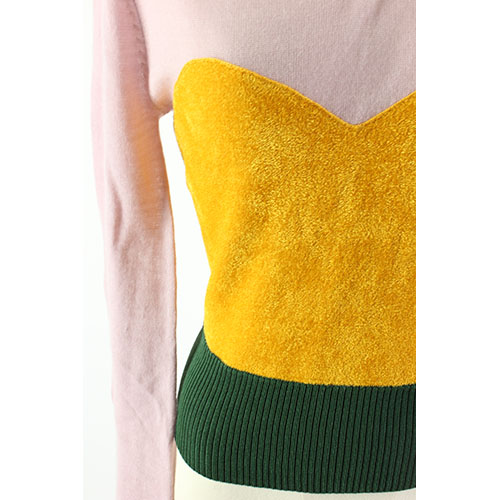 一枚さらりと着るだけで、主役級の存在感を放つニットです。バスト位置に合わせて波型のように縫い合わされたデザインがアクセントに◎Vネック周りのハイゲージニットに起毛ニットを縫い合わせ、リブ素材をつなげるという高度な技術を使ってる、他にはないデザインです