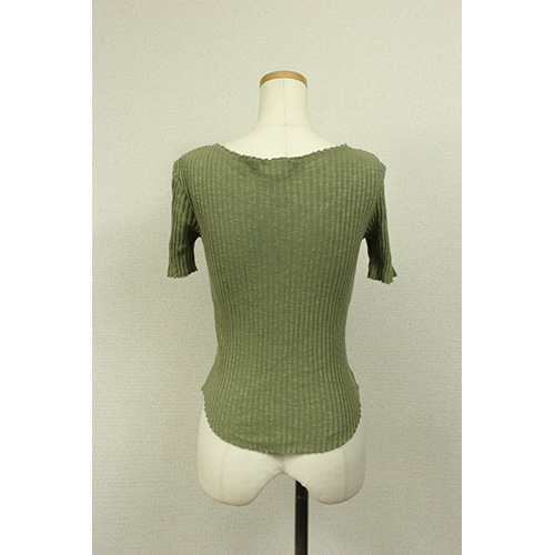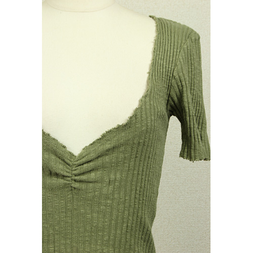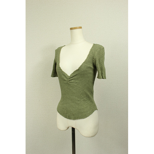 切りっ放し風デザインがオシャレなリブトップスです。身体にフィットするタイトなシルエット。ざっくり開きのVネックで大人セクシーな印象に◎