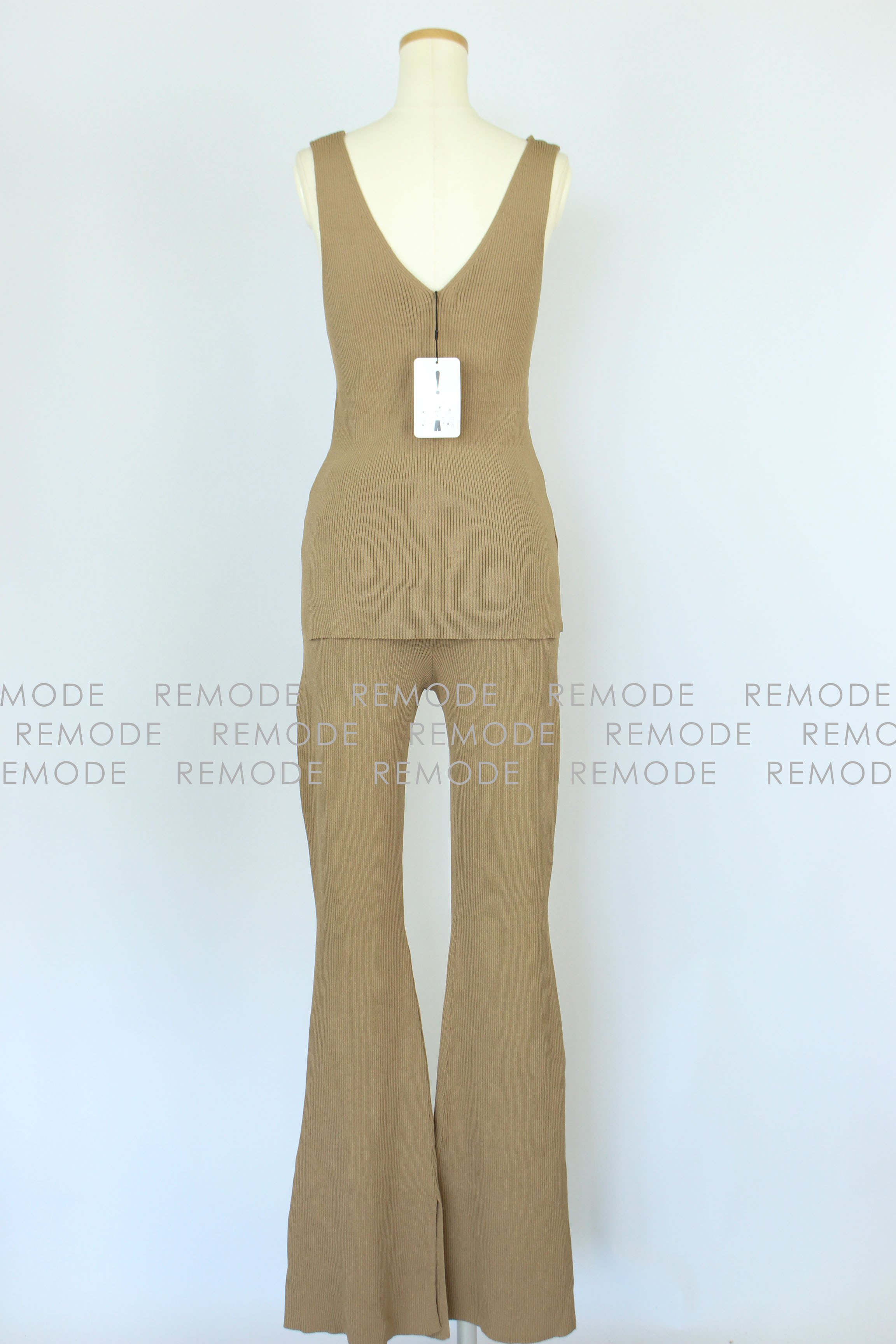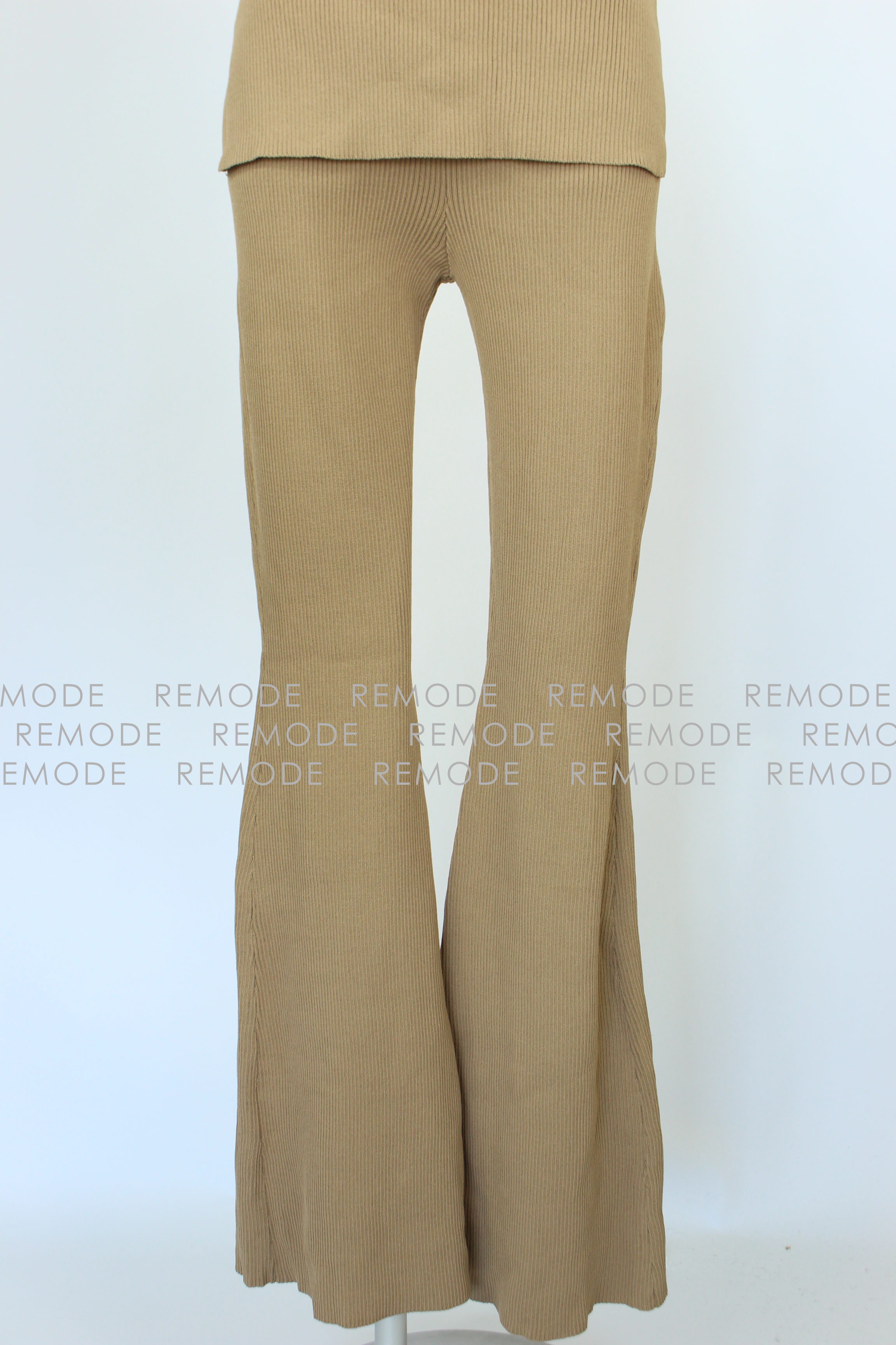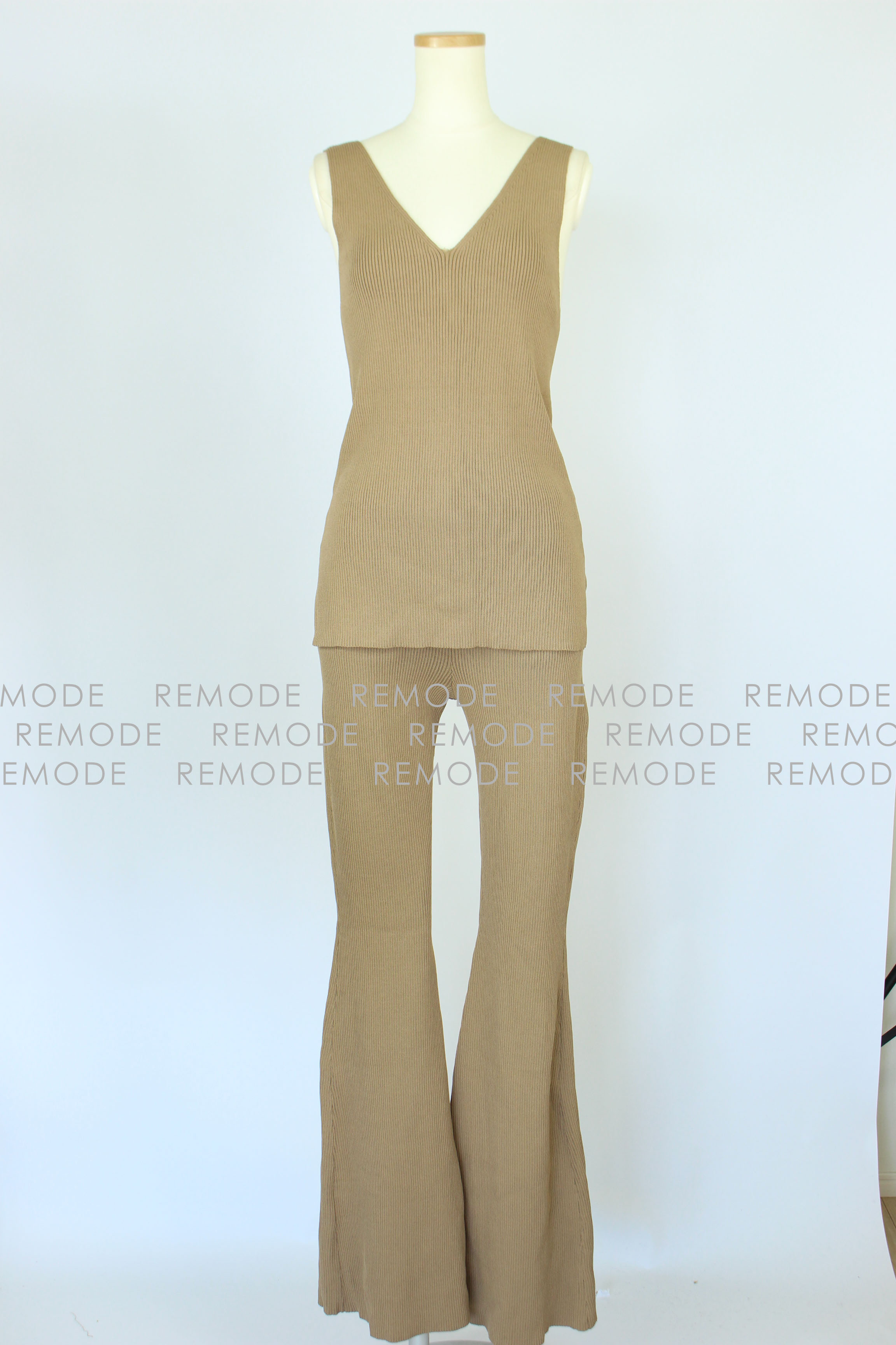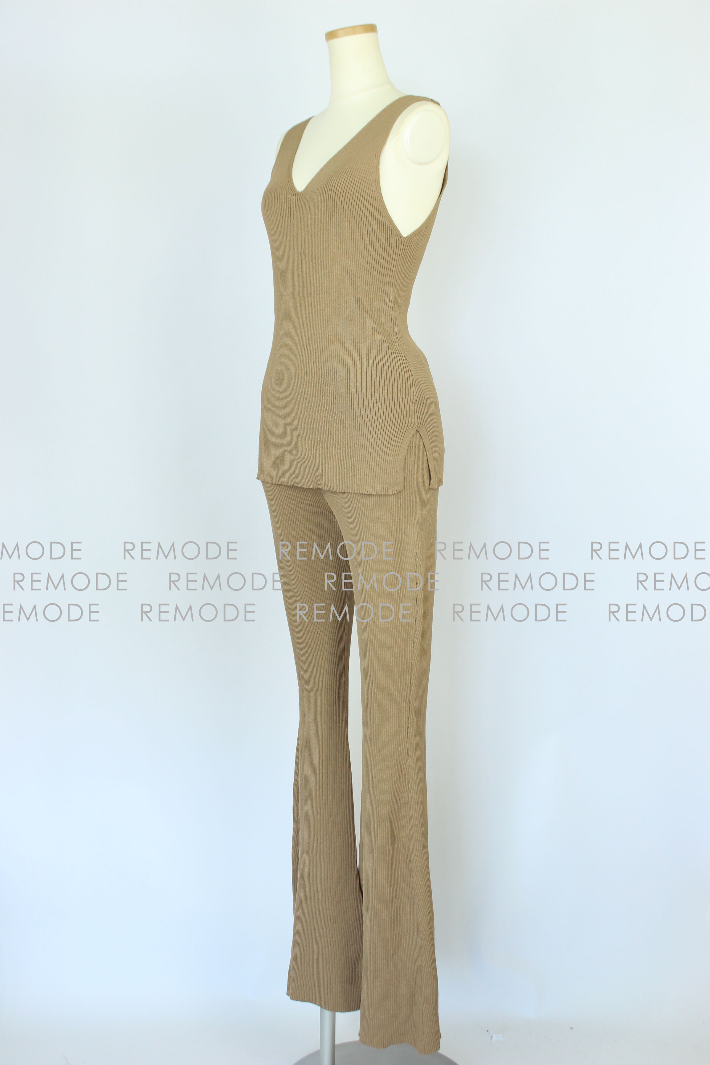 - さらりとした肌触りの糸を使用したワイドリブのパンツセットアップ。パンツのセットアップは今年欠かせないトレンドアイテムです。 トップスは他のコーディネートでも合わせ易いシンプルなノースリーブニット。ボトムスは膝から裾に向かって広がるベルボトムで、大変きれいなシルエットに仕上がります。カジュアルパンツなのにどこか大人の雰囲気に。おうちでのリラックスウエアとしてももちろん、旅行時に1セット持っていくとコーデの幅が広がります。さらにシワになりにくいので、飛行機やドライブなど長時間座っている機会にも活躍するアイテムです。