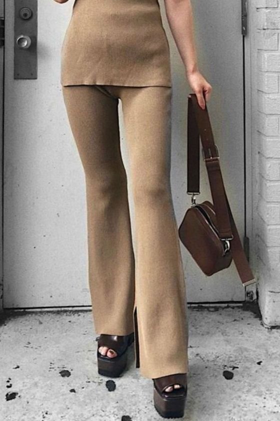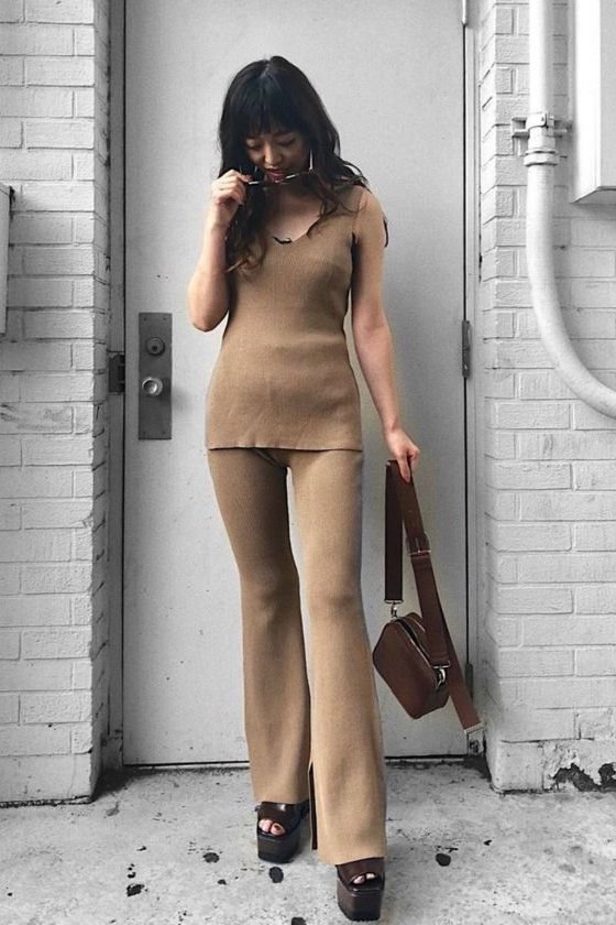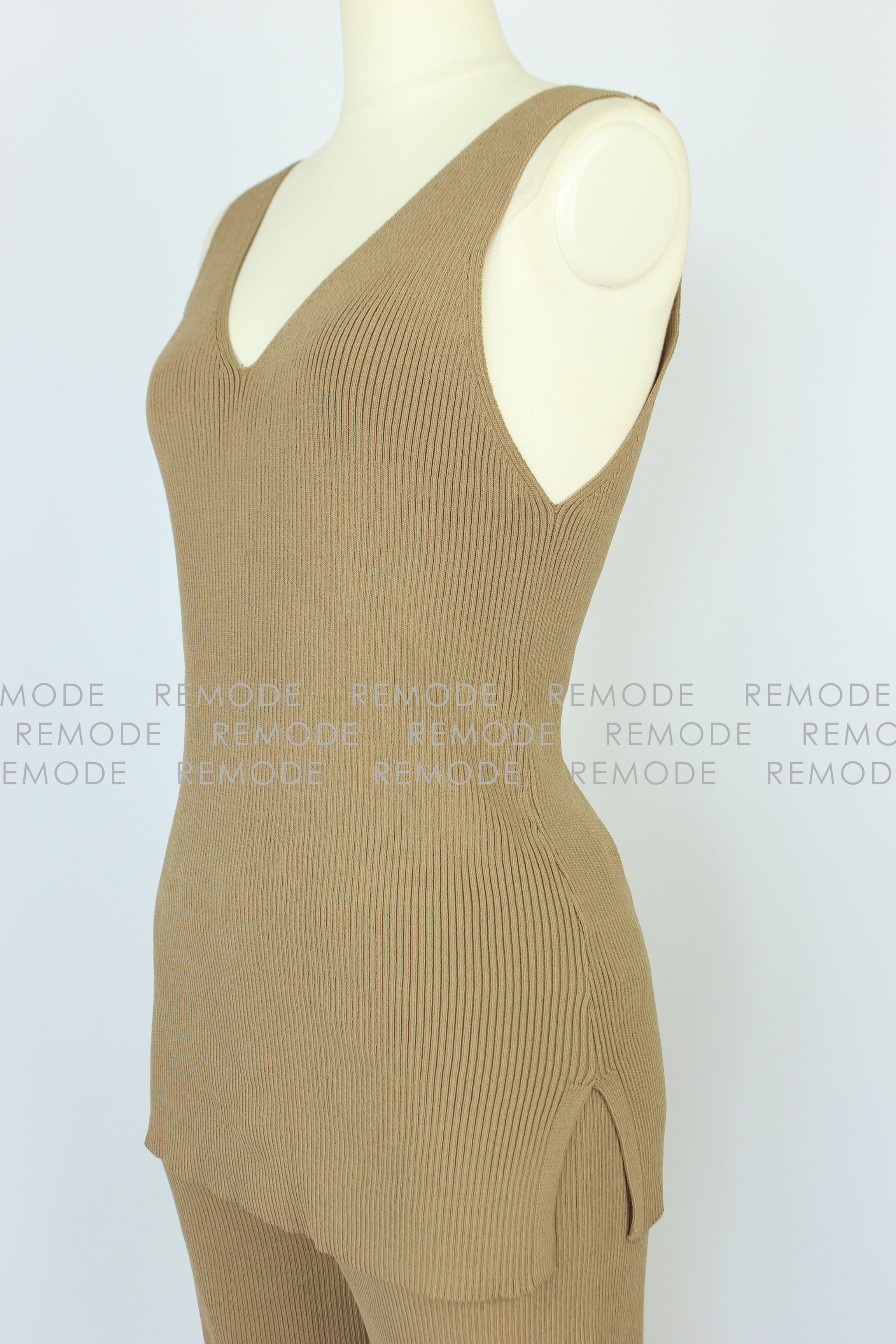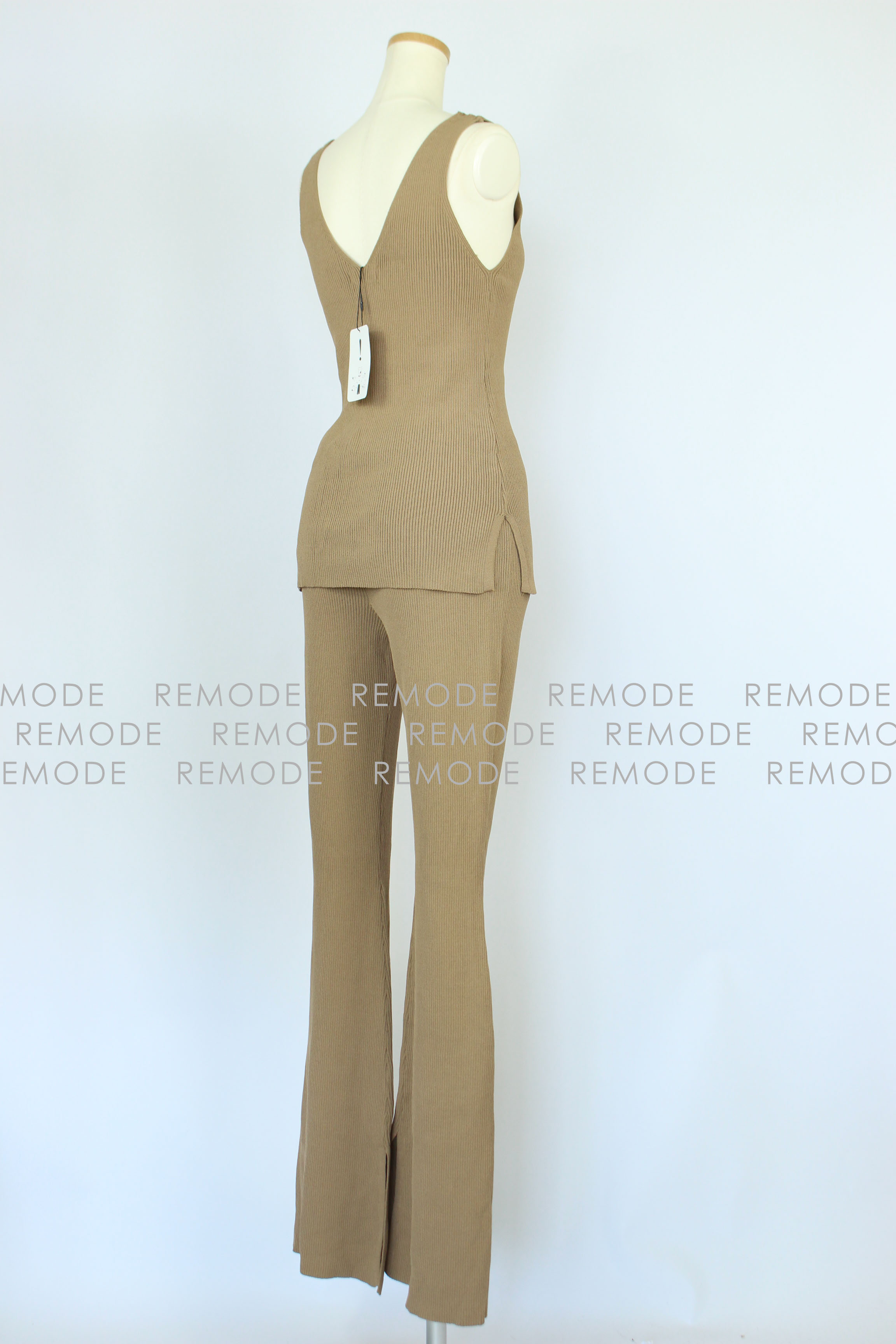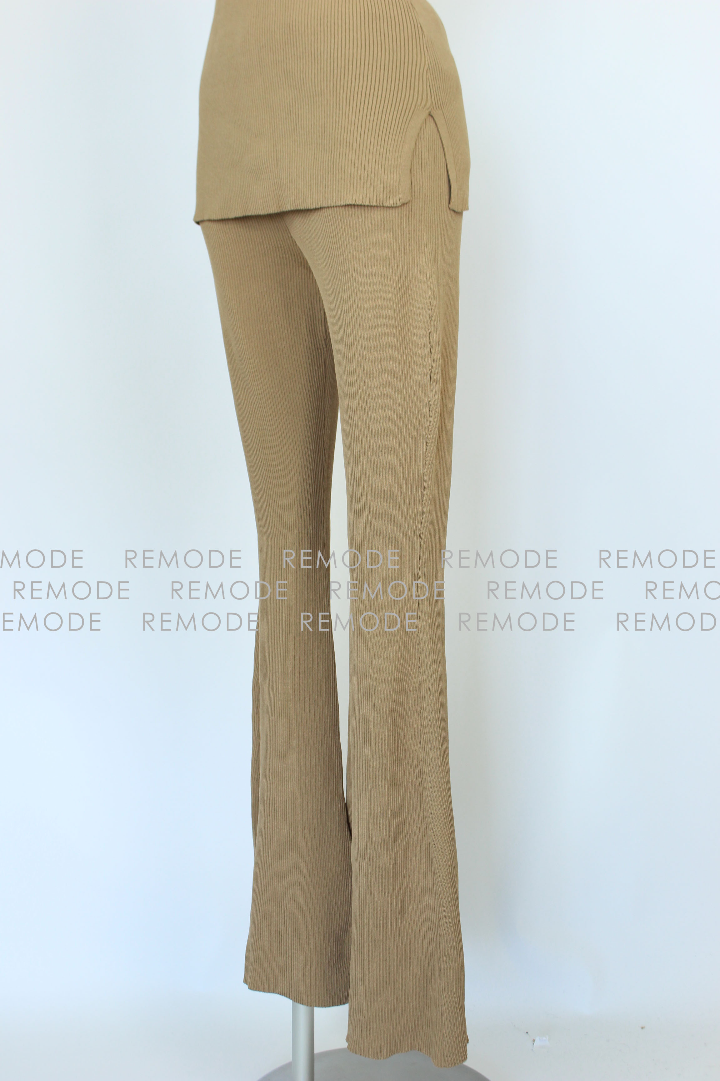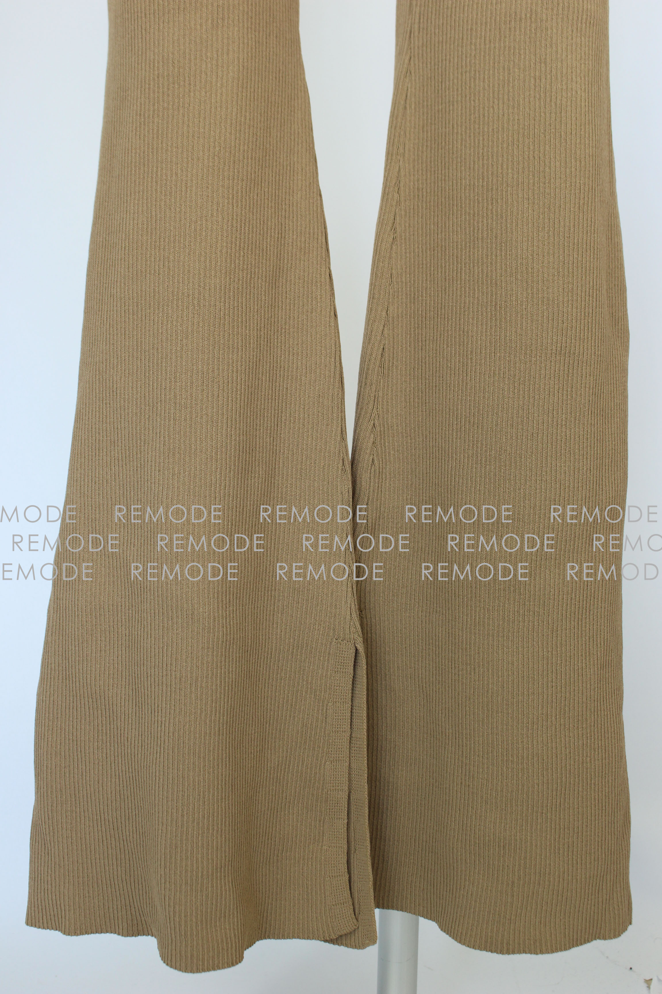 - さらりとした肌触りの糸を使用したワイドリブのパンツセットアップ。パンツのセットアップは今年欠かせないトレンドアイテムです。 トップスは他のコーディネートでも合わせ易いシンプルなノースリーブニット。ボトムスは膝から裾に向かって広がるベルボトムで、大変きれいなシルエットに仕上がります。カジュアルパンツなのにどこか大人の雰囲気に。おうちでのリラックスウエアとしてももちろん、旅行時に1セット持っていくとコーデの幅が広がります。さらにシワになりにくいので、飛行機やドライブなど長時間座っている機会にも活躍するアイテムです。