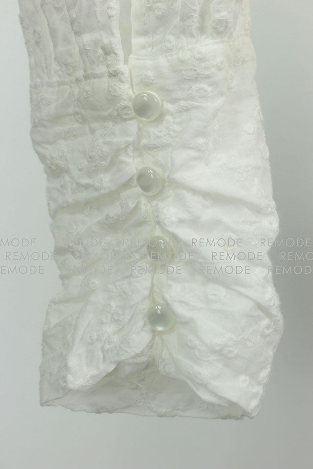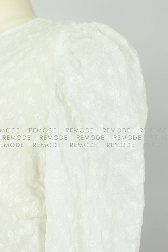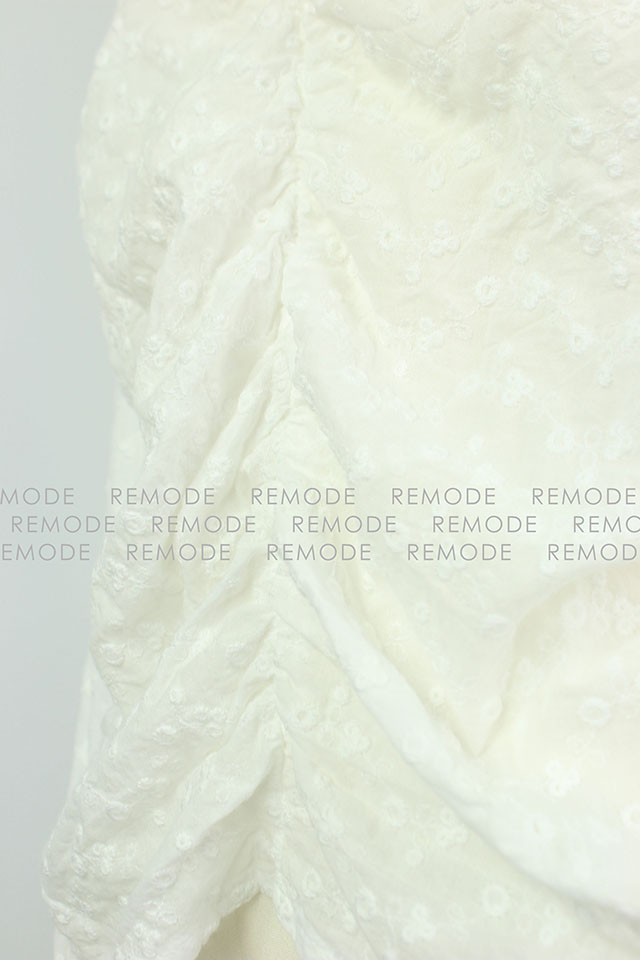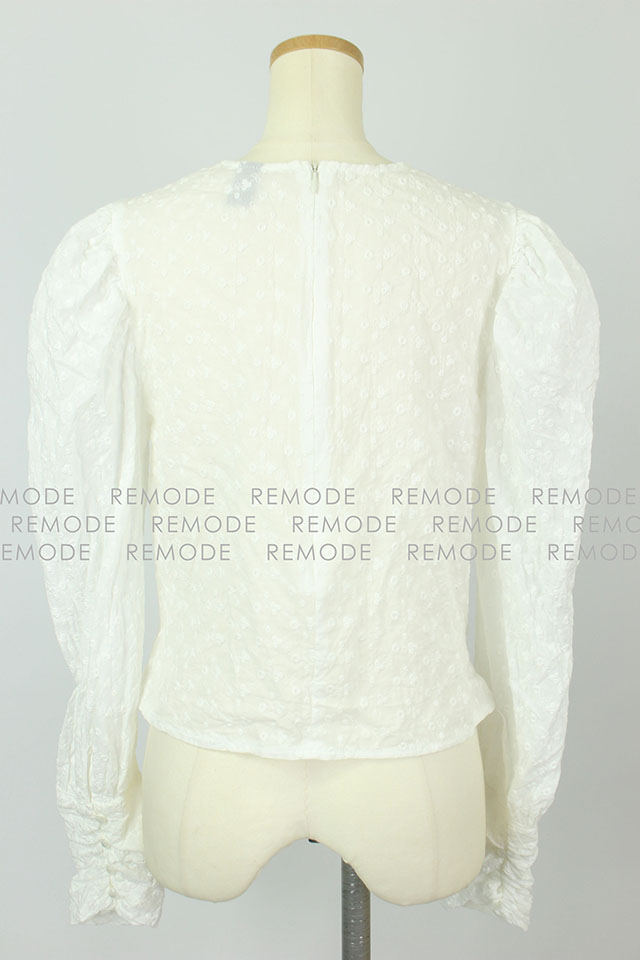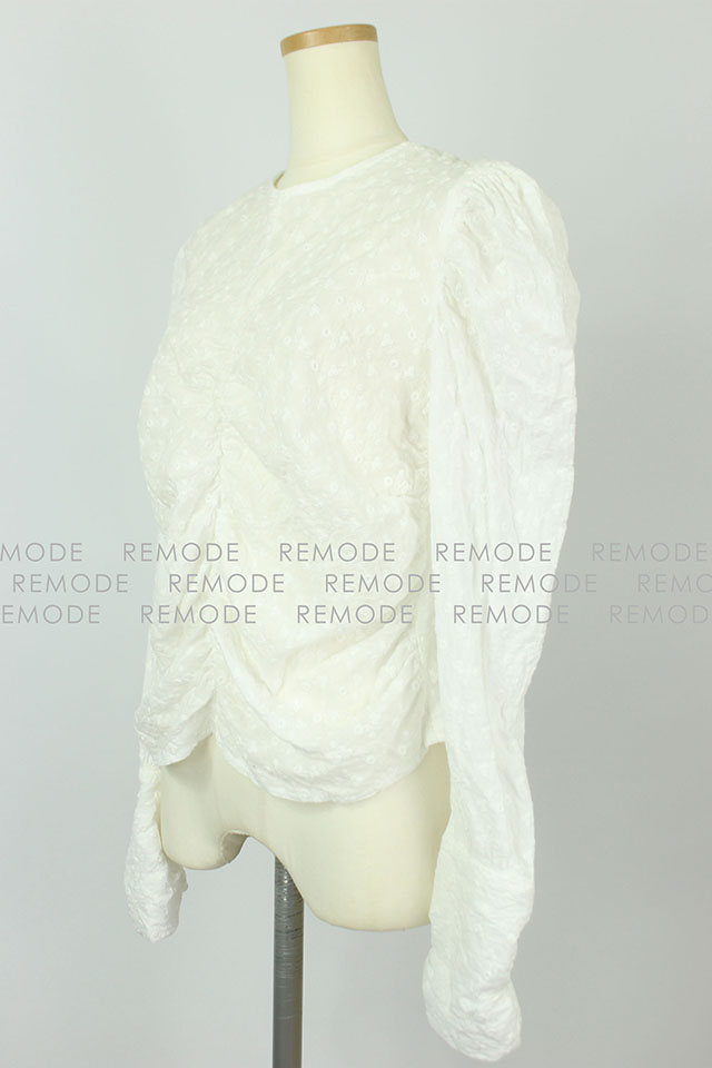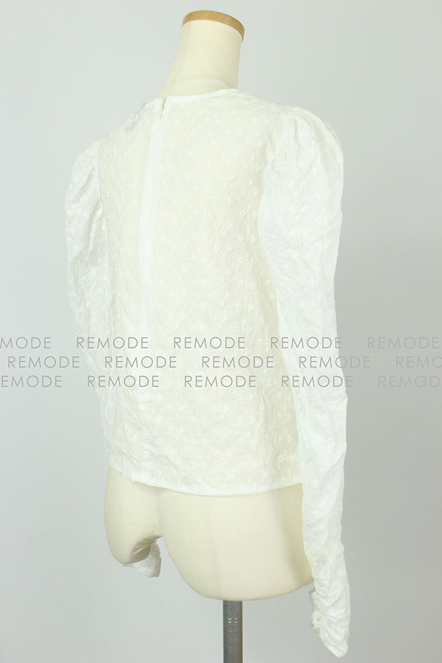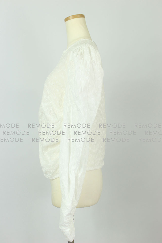 - 裾のフロントとサイドに入れたギャザーデザインで波のシルエットが女らしさをアップしてくれるブラウス。袖も女の子らしいパフスリーブで、二の腕もカバー。レディな気分を盛り上げてくれるアイテムです。
