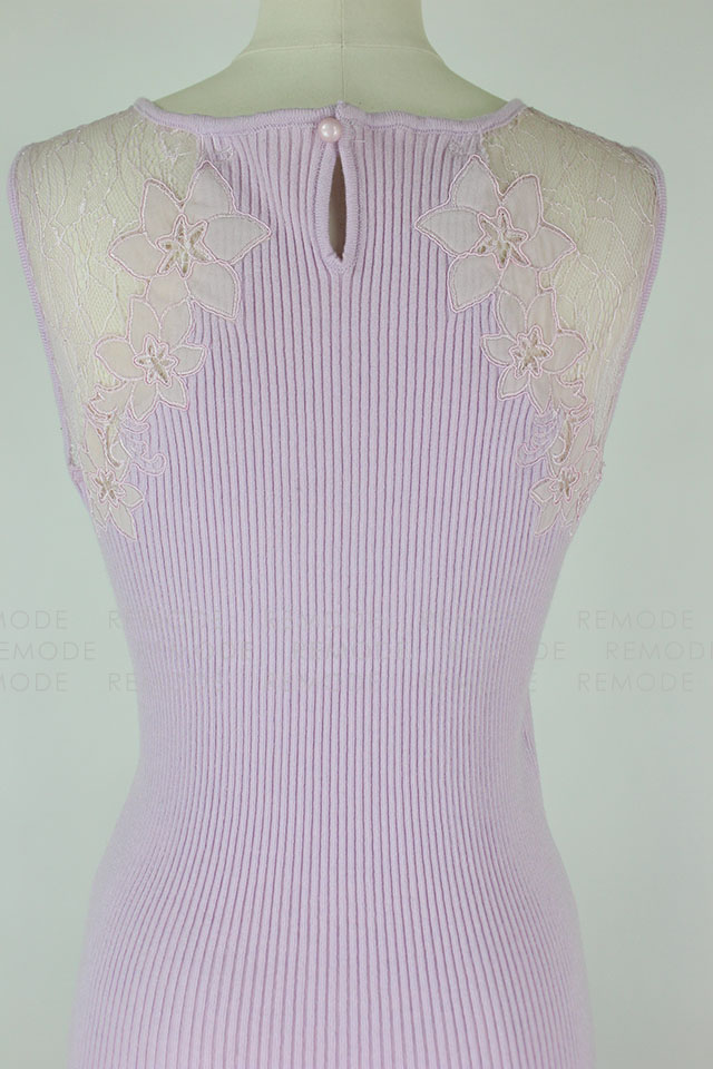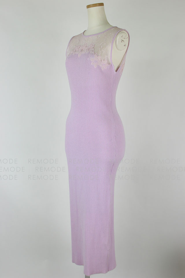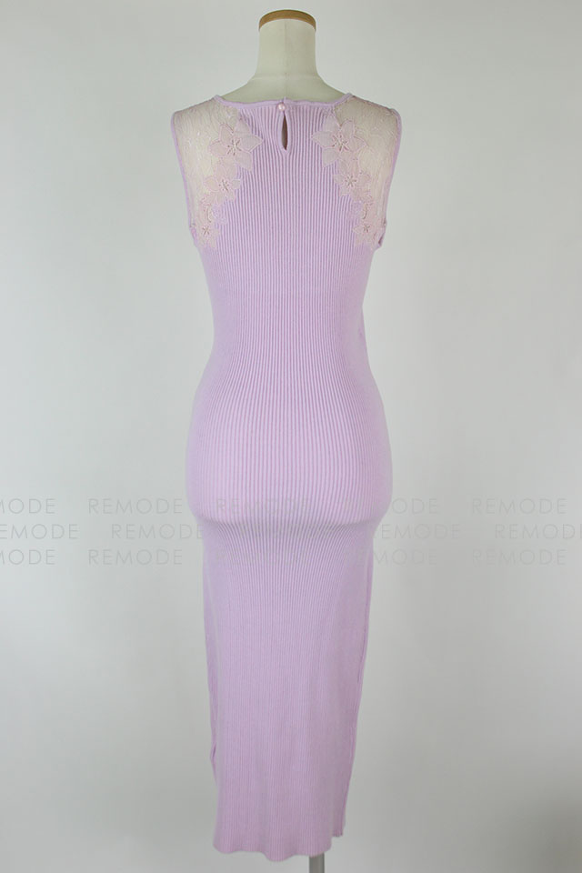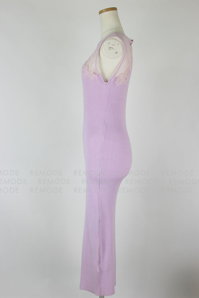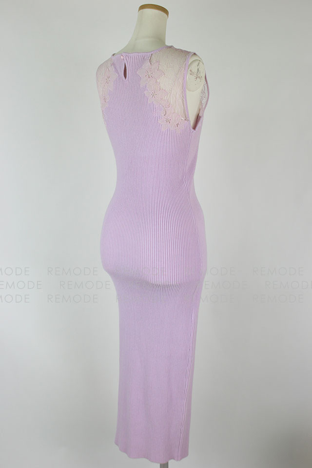 - すっきりと沿うようにフィットするノースリーブのリブワンピース。トップはシアーなレースで切り替えているから、デコルテからセンシュアルな魅力をアピールできそう。1枚で大人の女性らしさを演出できるアイテムです。