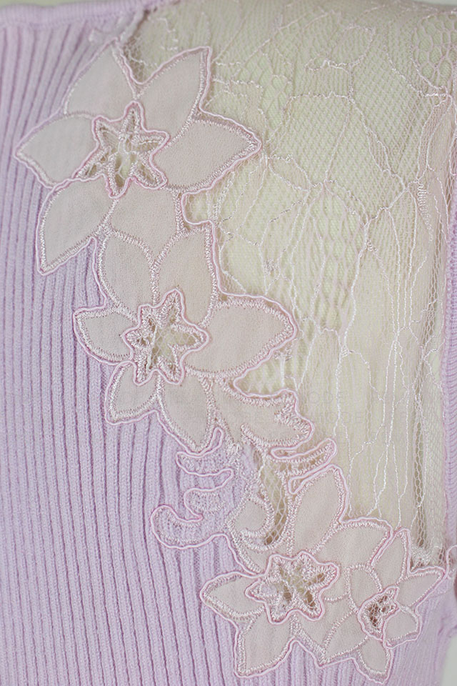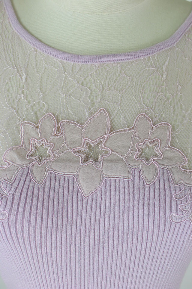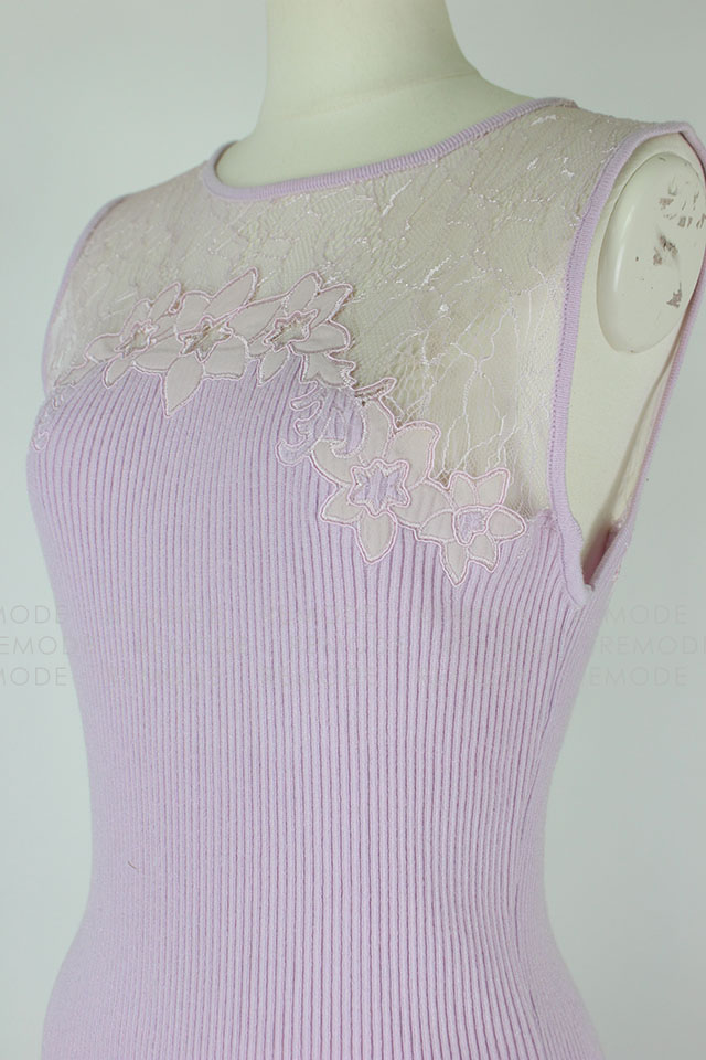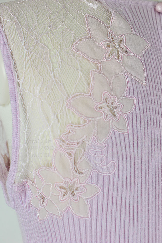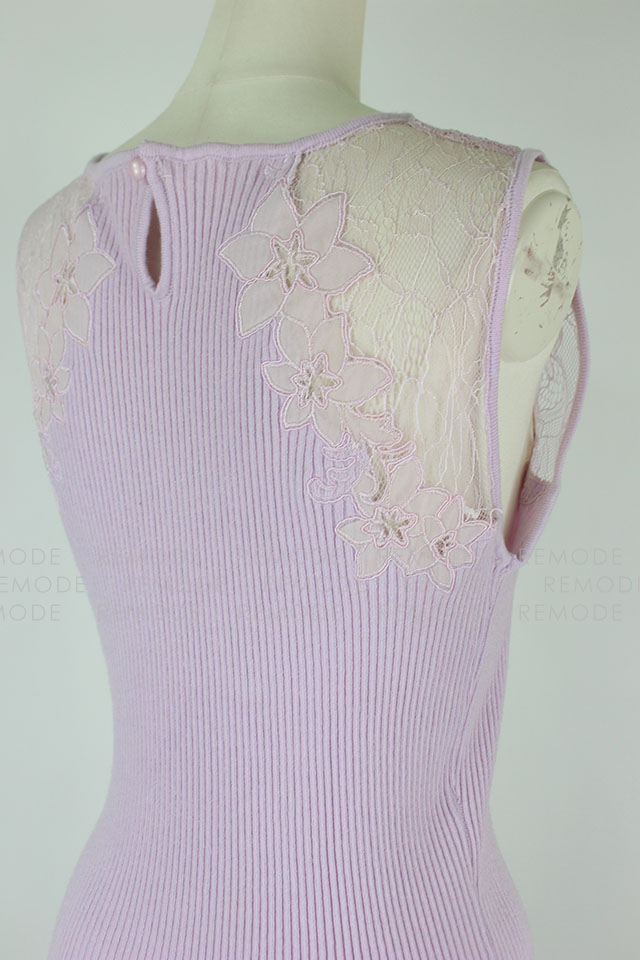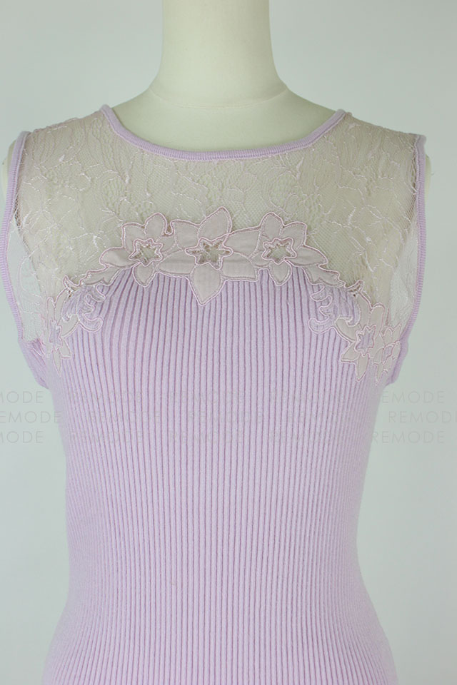 - すっきりと沿うようにフィットするノースリーブのリブワンピース。トップはシアーなレースで切り替えているから、デコルテからセンシュアルな魅力をアピールできそう。1枚で大人の女性らしさを演出できるアイテムです。