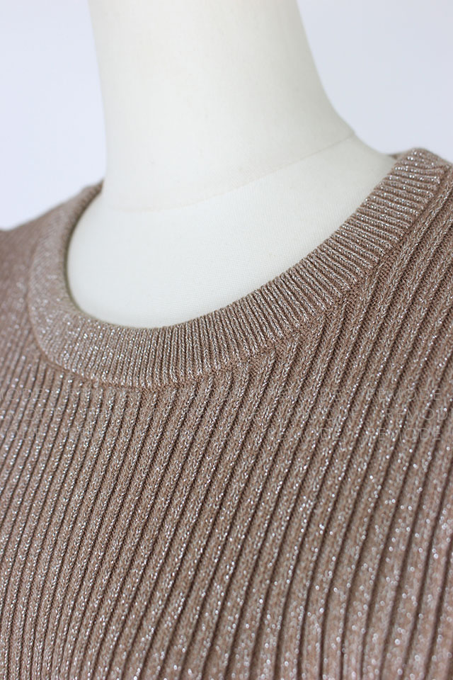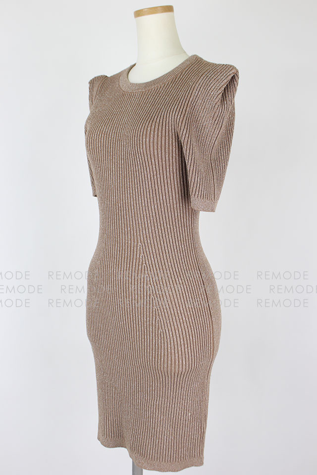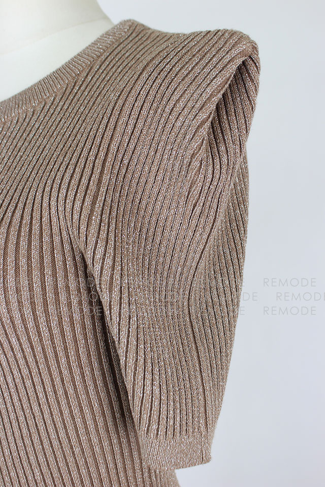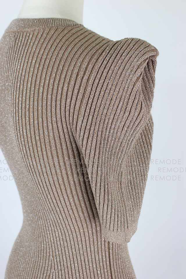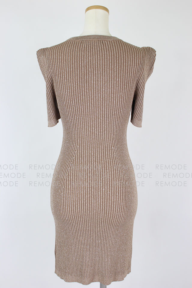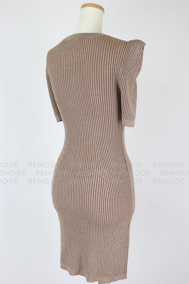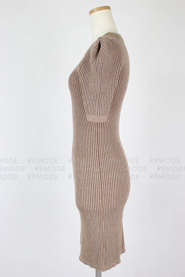 - 大人レディに仕上がるリブニットワンピースです。パワーショルダーデザインが凛とした女性らしさを演出します。大人の気品漂う五分丈の袖がほっそりとした腕周りに。リブニットの編み目を細めに設定して、美しい身体のラインを表現しています。やや厚みのあるリブの編地なのでボディラインを拾いすぎず、スタイルよく見せてくれる1枚。同色の細かいラメ糸をあしらい、上品な印象に仕上っています。