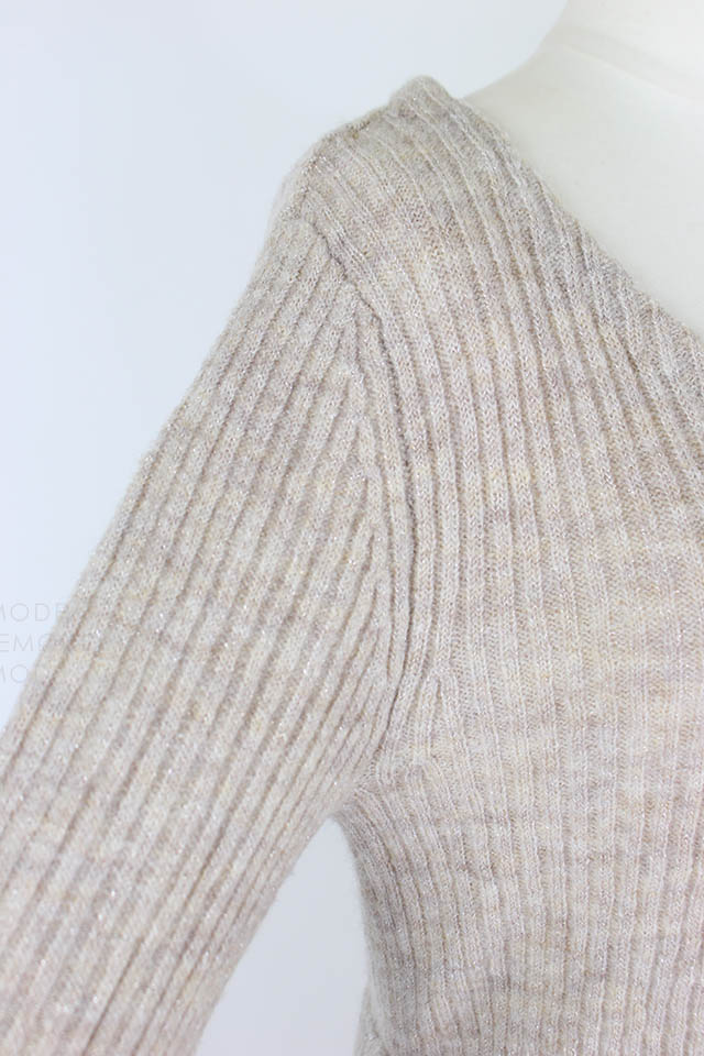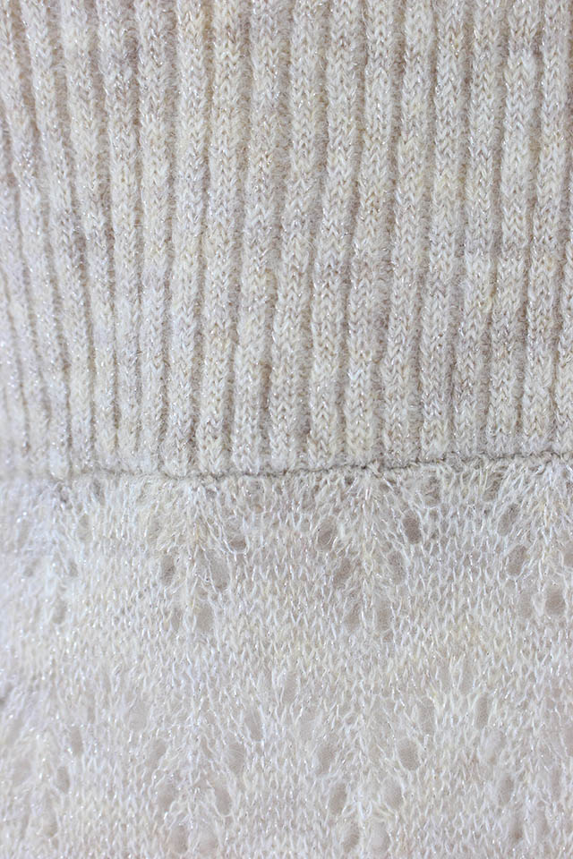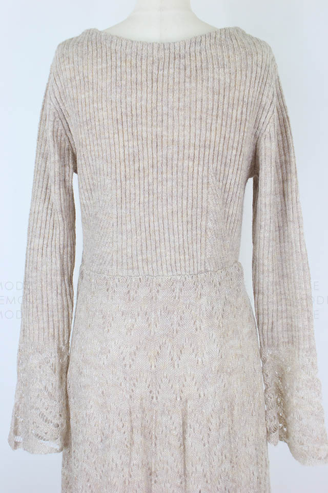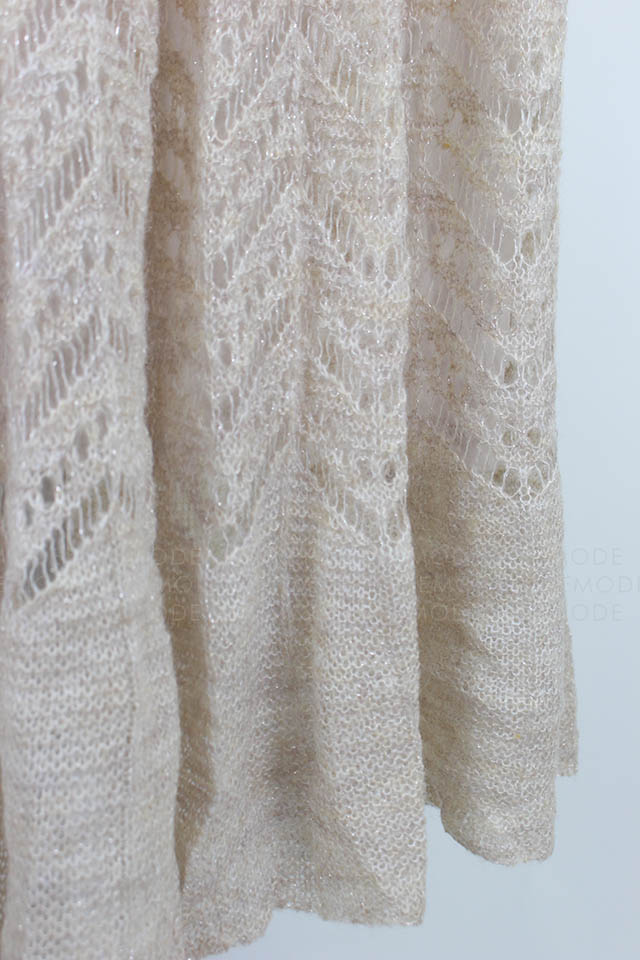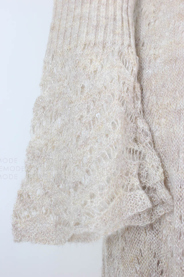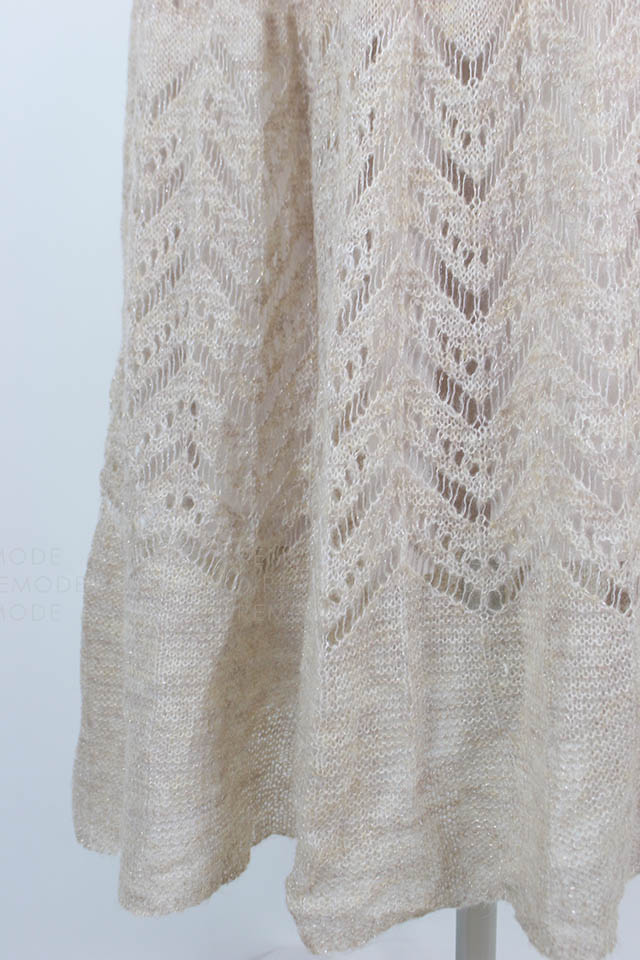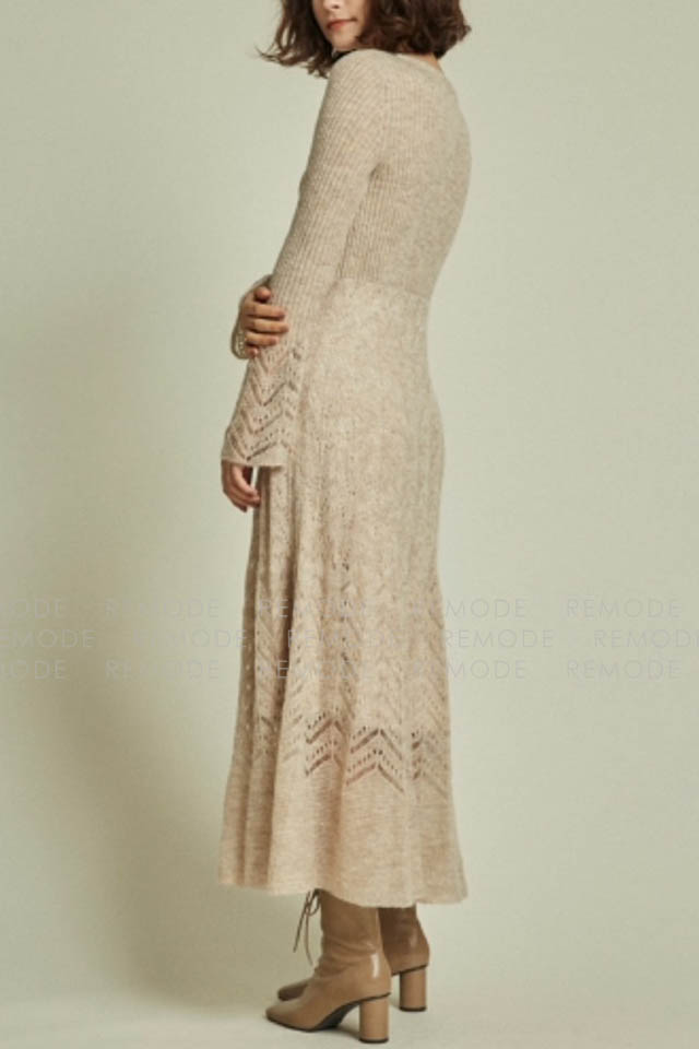 - シアー感のある糸が混じったふわふわの糸で編み上げたニットワンピースです。袖口とスカート部分に透かし編みを取り入れることで、ヴィンテージな雰囲気を表現しました。さらに前後着用可能な2way仕様となっており、背中を見せたい時はさりげなく開いたバックオープンデザインで大人っぽさを、デコルテを見せたい時は女性らしさを引き出してくれます。