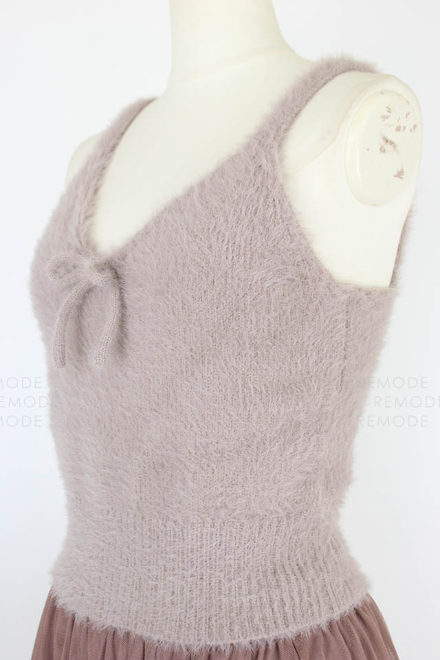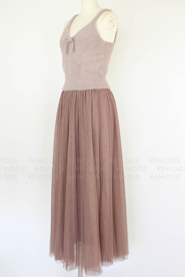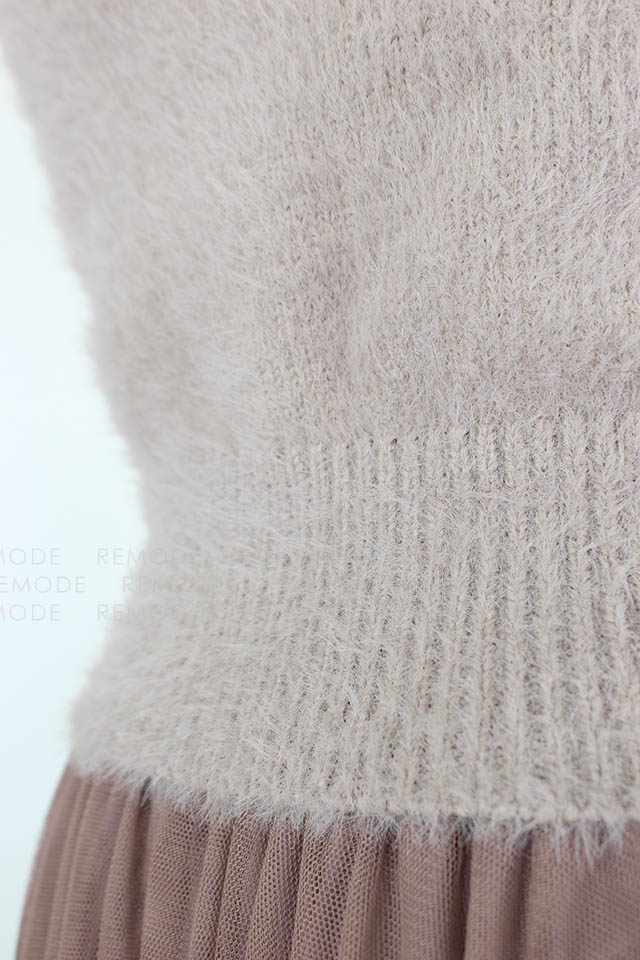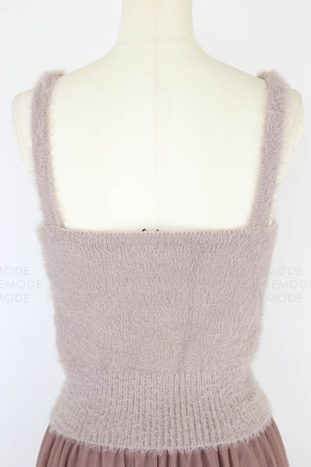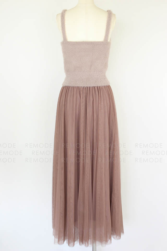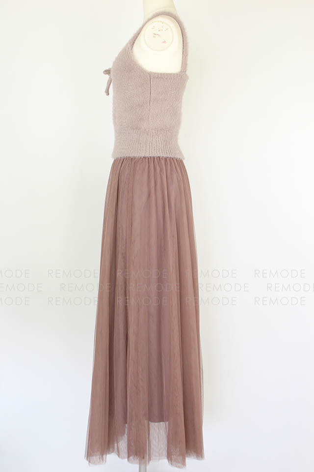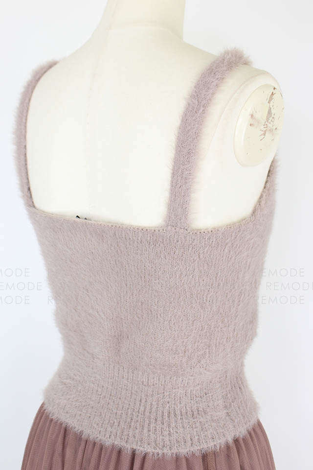 - ニットビスチェとチュールスカートのセットアイテム。 ニットビスチェは毛足のあるフェザーヤーンを使用しているので、ふんわりした風合いをあり可愛い雰囲気に仕上げています。チュールスカートはプリーツ加工をかけ、スカート丈を長くする事で甘さを抑えてビスチェとのバランスをとりました。 また絶妙なワントーンカラーにこだわり、雰囲気あるアイテムになっています。レイヤードスタイルはもちろん、別々でも着用可能なので、抜け感のあるアンニュイなスタイリングをお楽しみ頂けます。