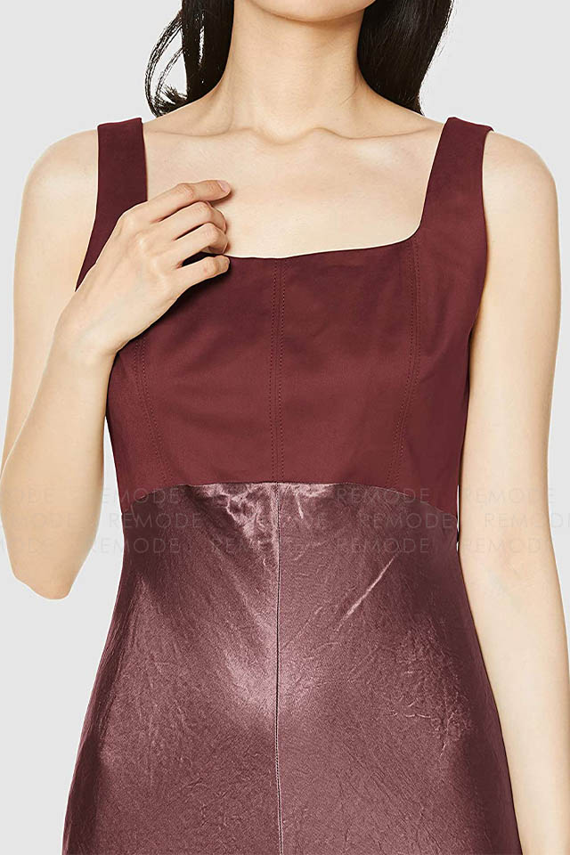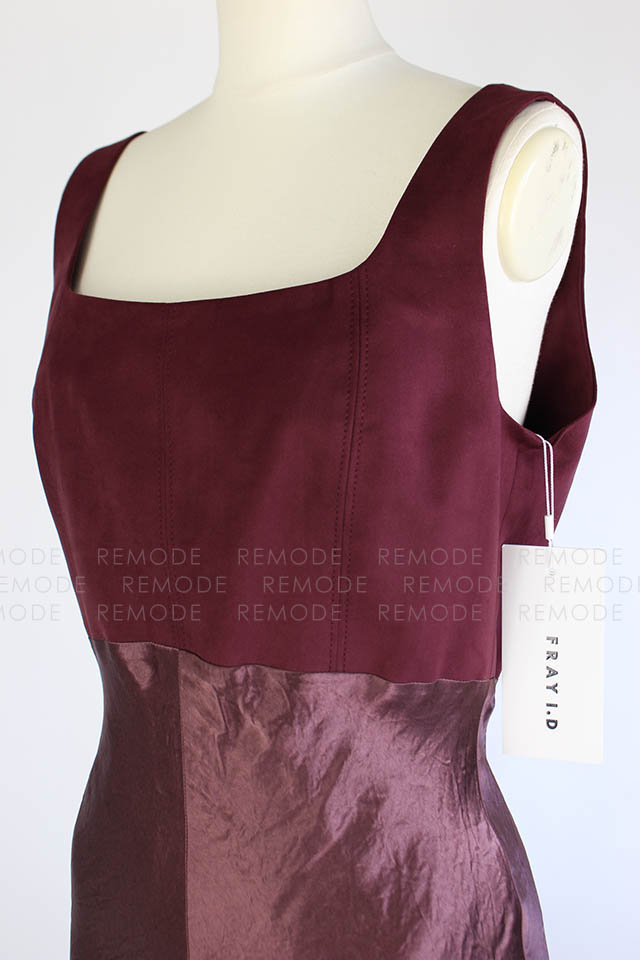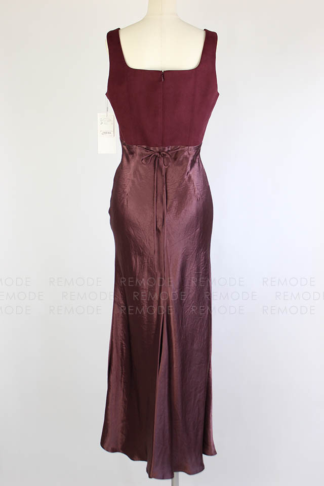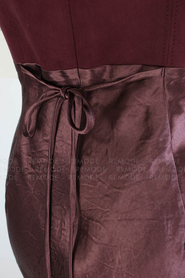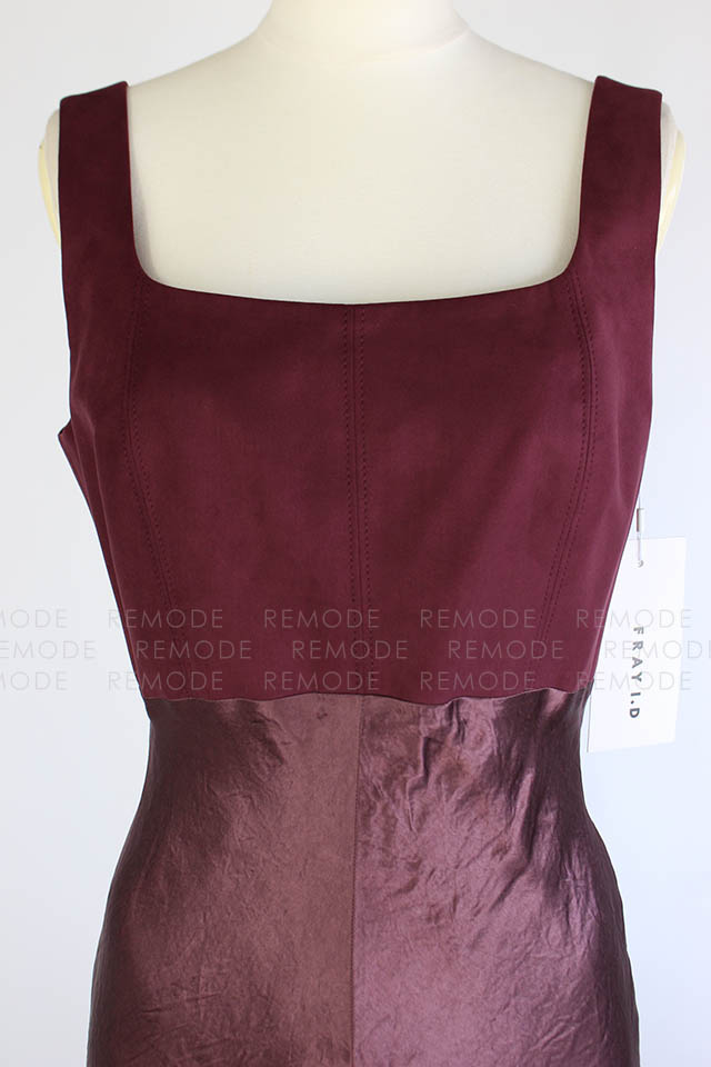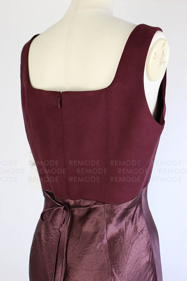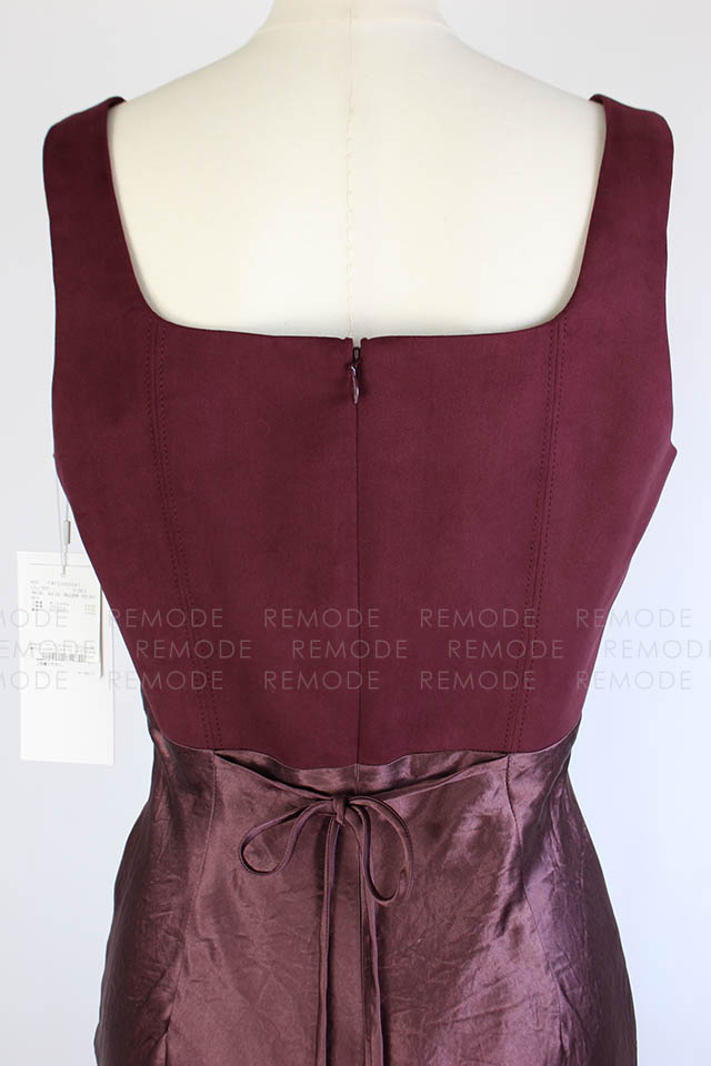 - ワントーンの微配色で切り替えたシルエットの美しいコンビネーションドレス。シンプルかつ上品なシルエットに微配色で切り替えた異素材コンビのロングドレスです。 上身頃はマットなコットンスエード、スカート部分はヴィンテージ風サテンの組み合わせで、素材を活かしたミニマルなデザインです。高めのウエスト部分は後ろに流れるような切り替えラインと、スカート部分は斜めのバイアス加工でボディラインをより美しく際立たせます。後ろのウエストリボンでフィット感のサイズ調整が可能です。 ヴィンテージ感のあるスエードとサテンの異素材ドッキングです。一枚で装いを格上げできるボルドーカラーがポイントです。