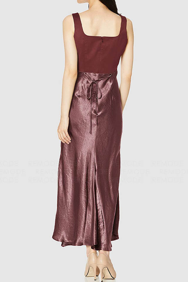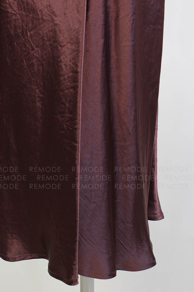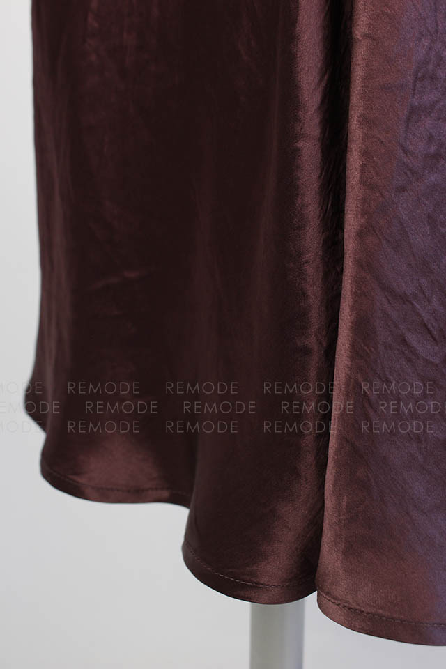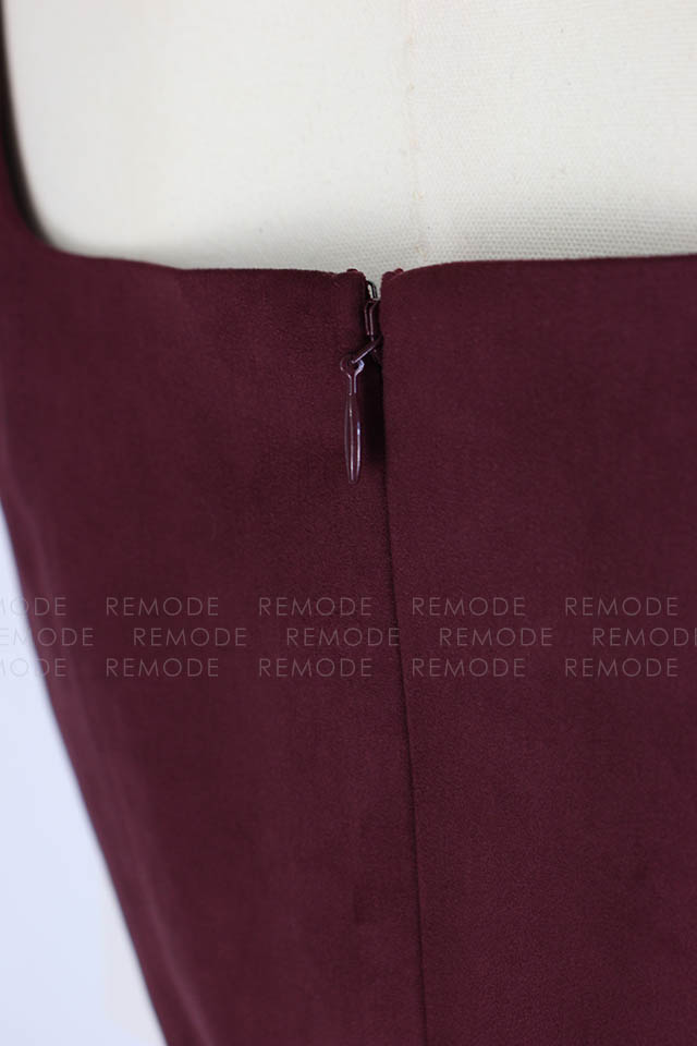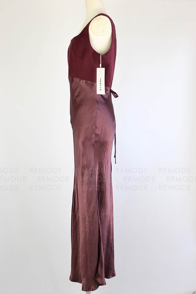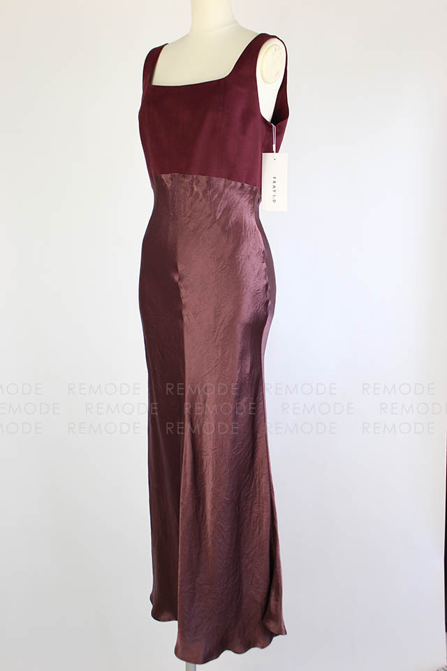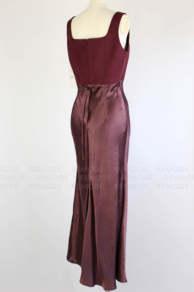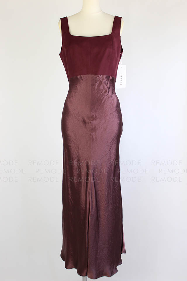 - ワントーンの微配色で切り替えたシルエットの美しいコンビネーションドレス。シンプルかつ上品なシルエットに微配色で切り替えた異素材コンビのロングドレスです。 上身頃はマットなコットンスエード、スカート部分はヴィンテージ風サテンの組み合わせで、素材を活かしたミニマルなデザインです。高めのウエスト部分は後ろに流れるような切り替えラインと、スカート部分は斜めのバイアス加工でボディラインをより美しく際立たせます。後ろのウエストリボンでフィット感のサイズ調整が可能です。 ヴィンテージ感のあるスエードとサテンの異素材ドッキングです。一枚で装いを格上げできるボルドーカラーがポイントです。